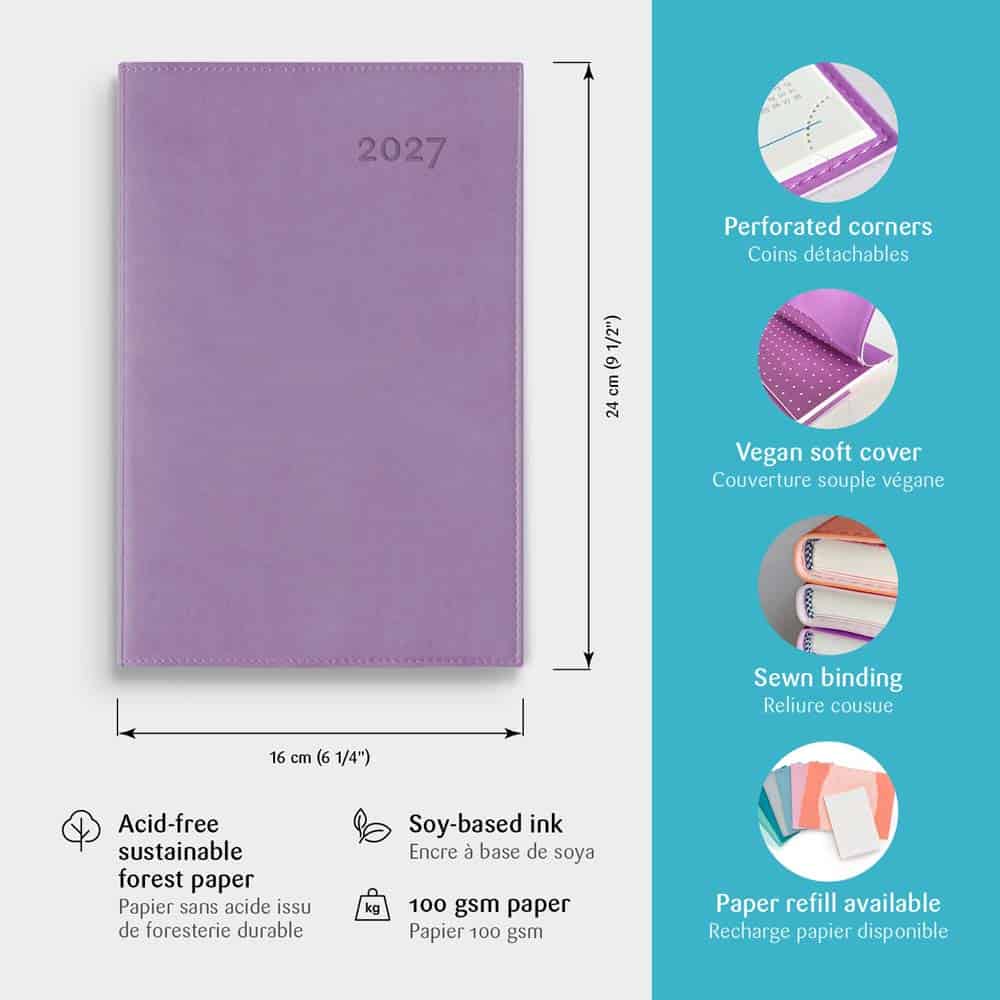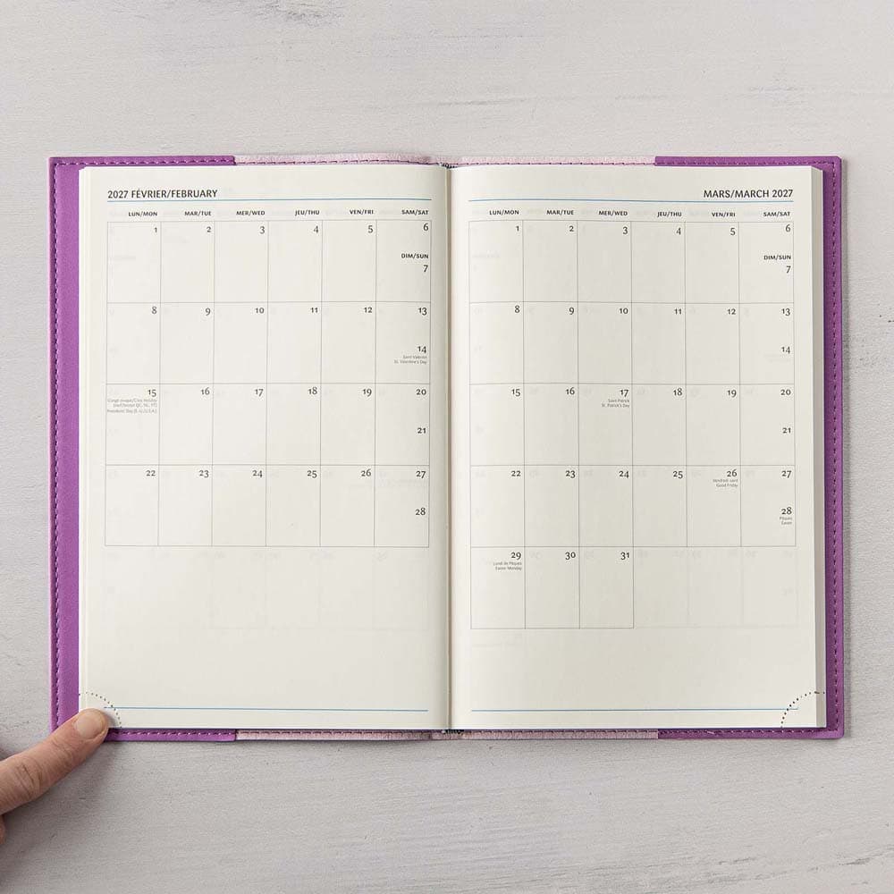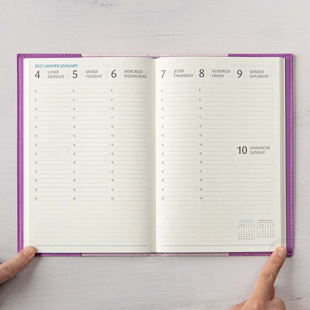 The Gama is among our most popular agendas. With its soft flexible cover, it is available in 6 colours. Ideal for those who like to have space to personalize their agenda: a generous section of notes is present on each page. The week-to-view layout allows an immediate overview of the current week. It also includes a 12-pages monthly planning section (1 month per page) and 18 lined pages for note-taking. The agenda opens flat and always on the right page, thanks to its detachable corners.