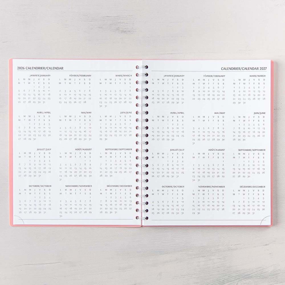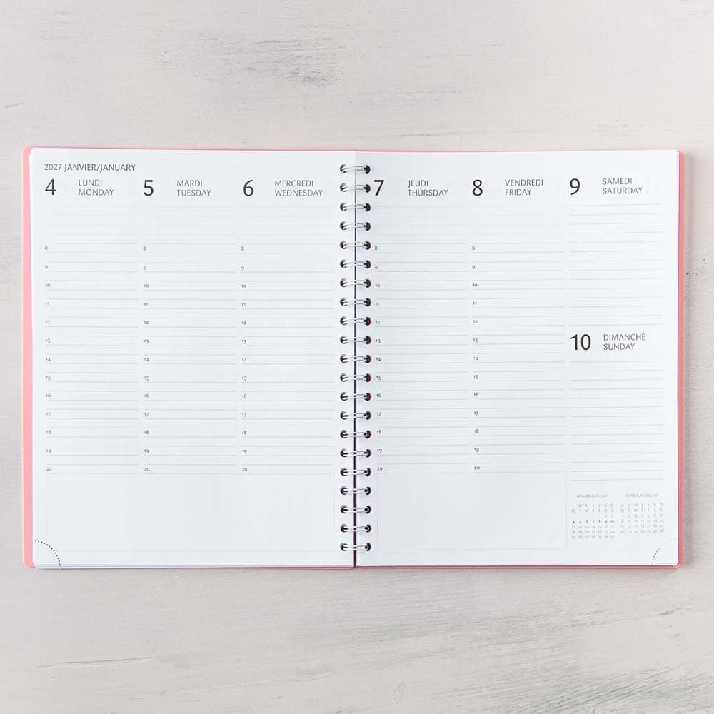 The Kibo is very popular among students. Its practicality has proven its worth. Large letter-format pages, the full week under your eyes with its week-to-view layout, a large box on each page to note whatever comes to mind, and 14 pages of notes. It can open at 360 degrees with its spiral binding, allowing you to write anywhere you are. It is easy to be always on the right page thanks to its detachable corners.