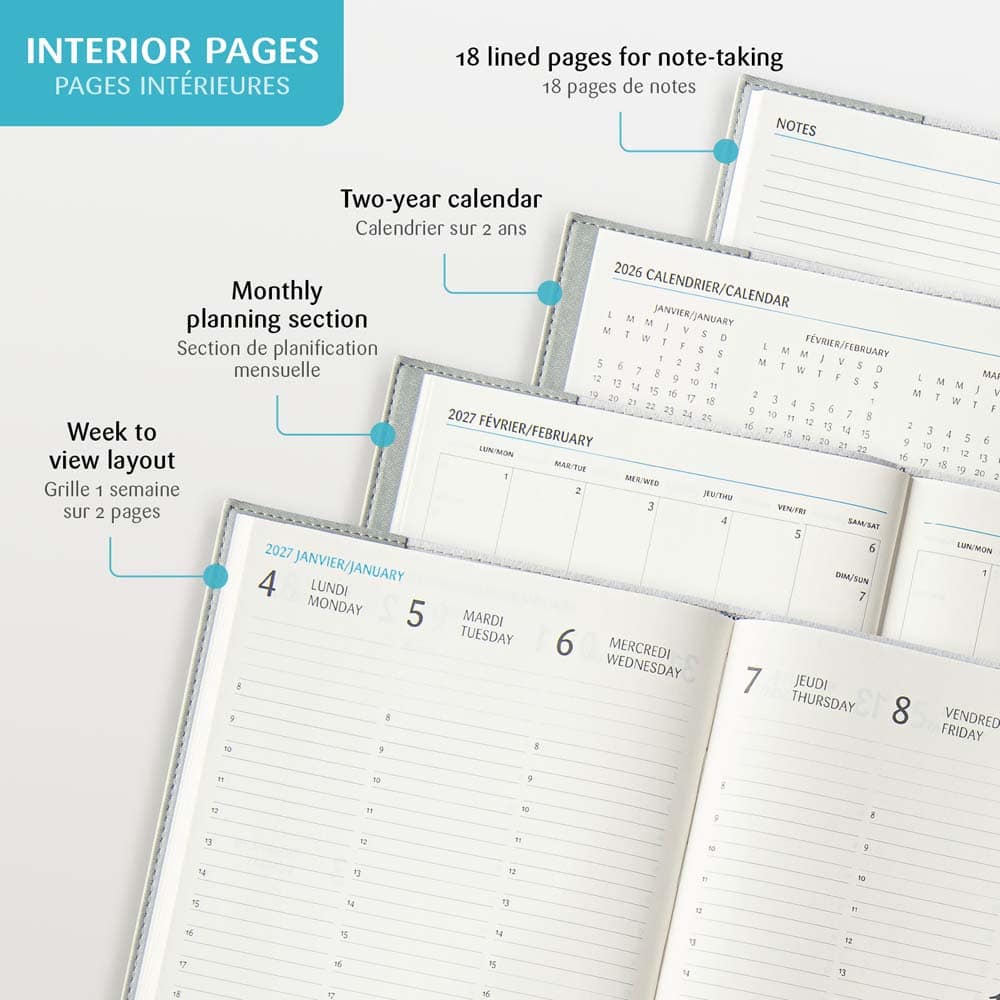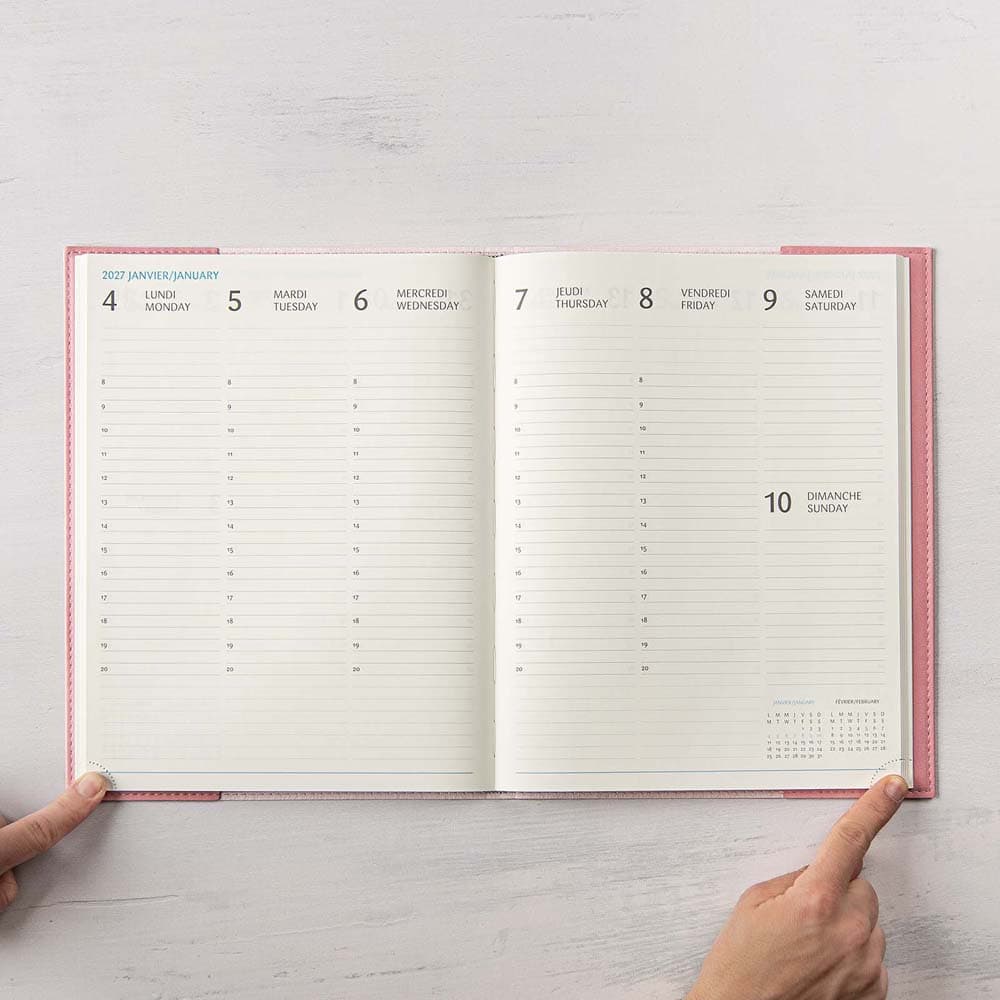 The large format of the Ulys is ideal for those who want to note every single thing. Its pages are letter format: to add a sheet of paper has never been so easy. The week’s plan is always in sight with its week-to-view layout, while the space above and below each day allows noting all additional information. The Ulys has a soft suede-like cover available in 6 colours and includes a monthly planning section (1 month per page) and 18 lined pages for notes.