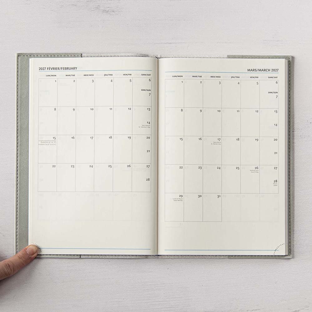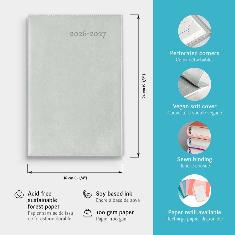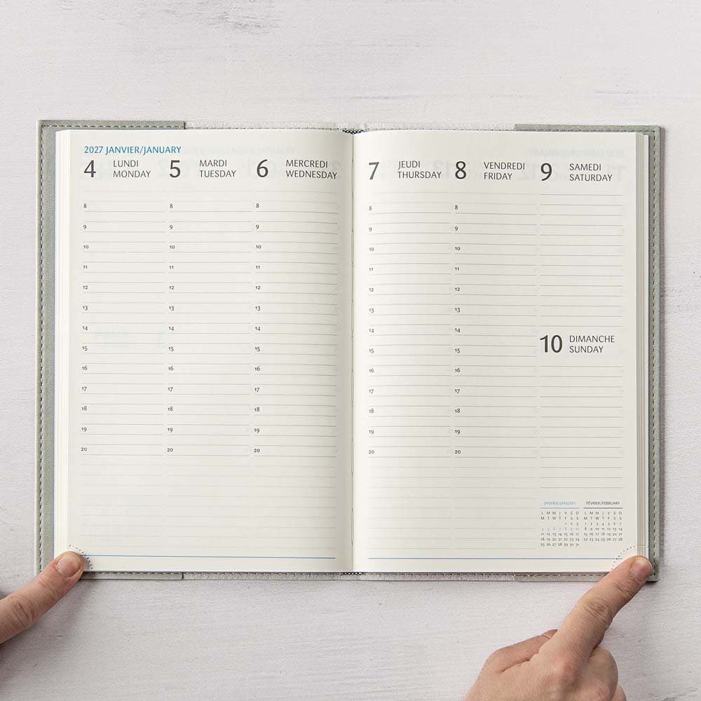 Le Gama est parmi nos agendas les plus populaires. Avec sa couverture souple et flexible, il est disponible en 6 couleurs. Idéal pour celles et ceux qui aiment avoir de l’espace pour personnaliser leur agenda : une généreuse section de notes est présente sur chaque page. La grille de 1 semaine sur 2 pages permet d’avoir un coup d’œil immédiat sur la semaine en cours. Il inclut aussi une section de planification mensuelle de 12 pages (1 mois par page) et 18 pages de notes lignées. L’agenda s’ouvre à plat et toujours à la bonne page, grâce à ses coins détachables.