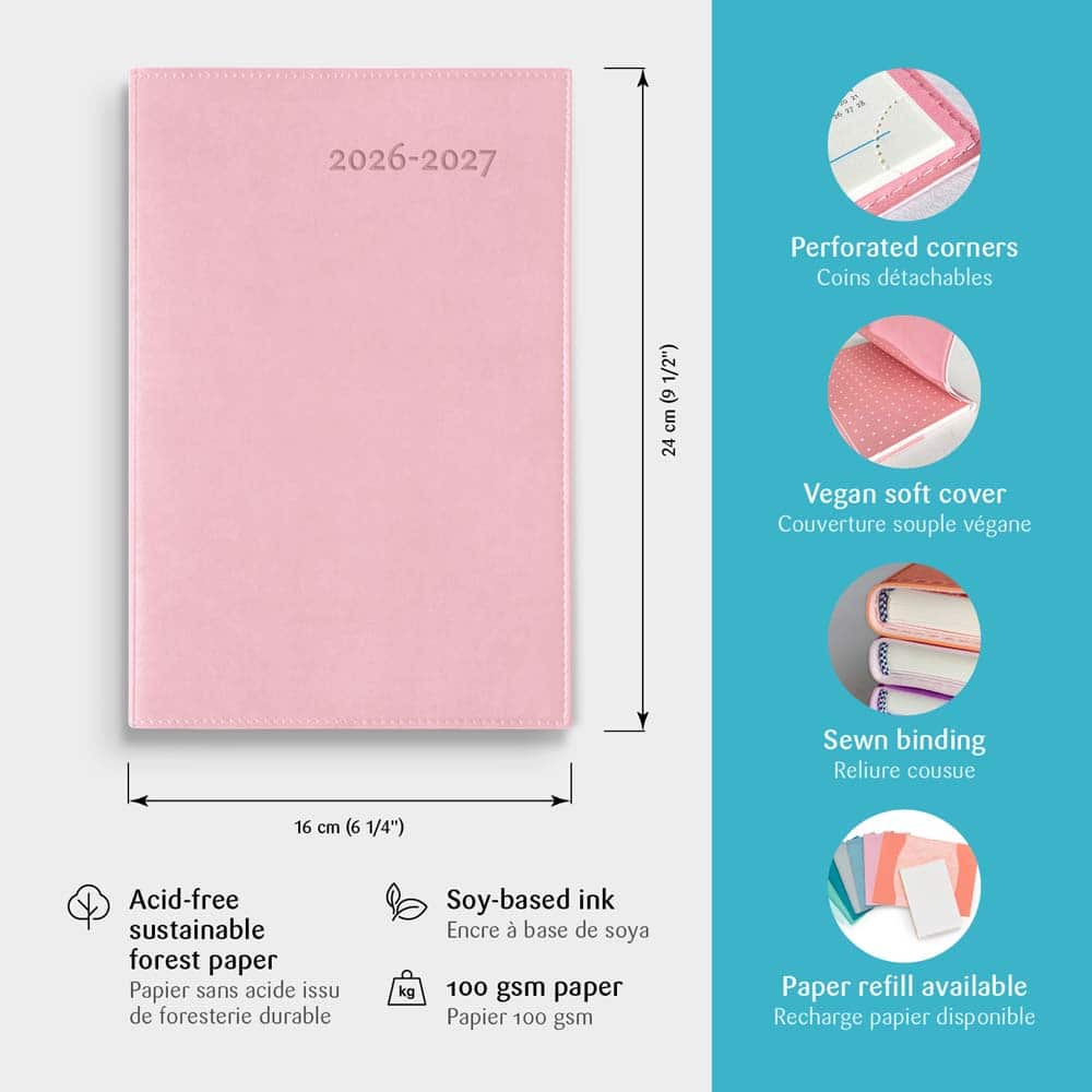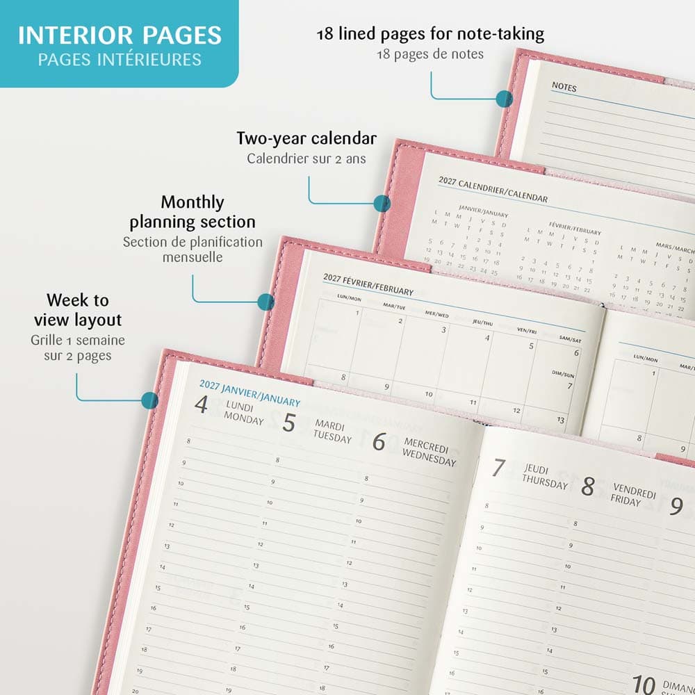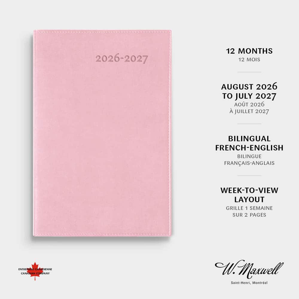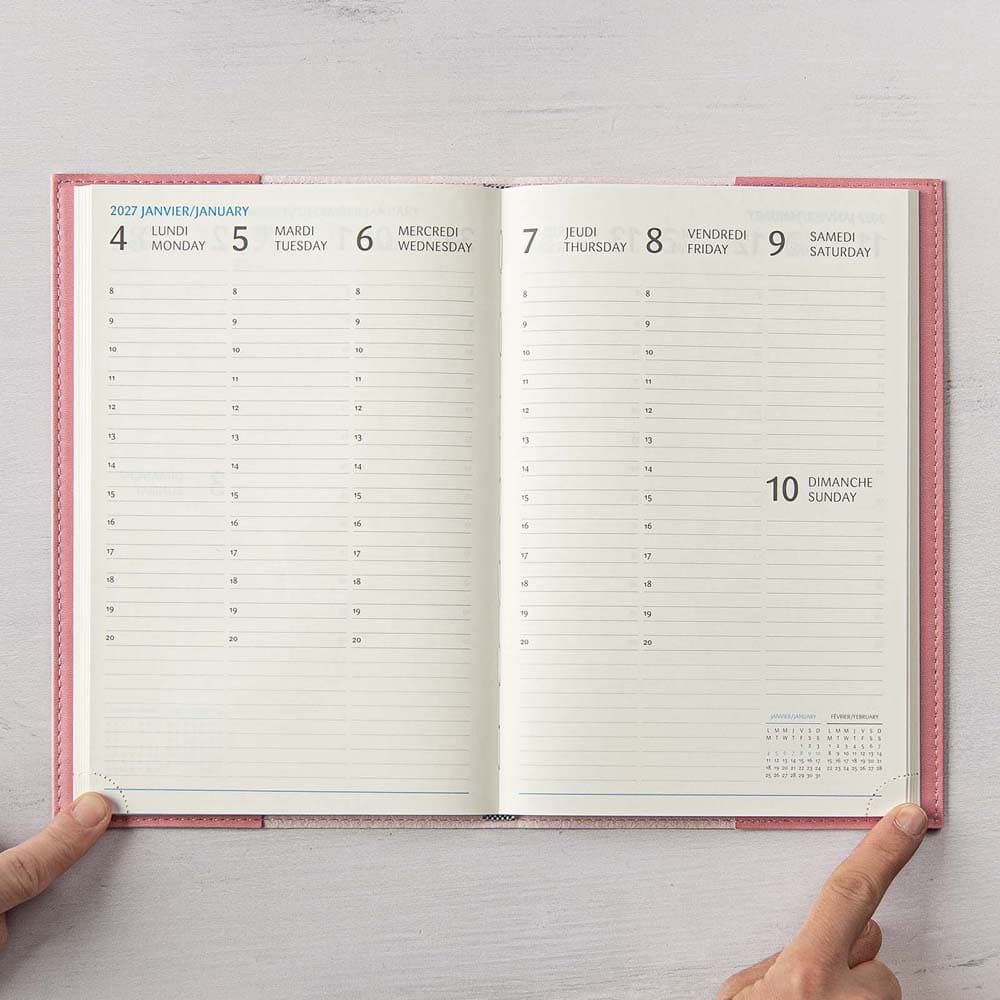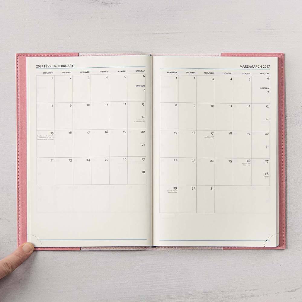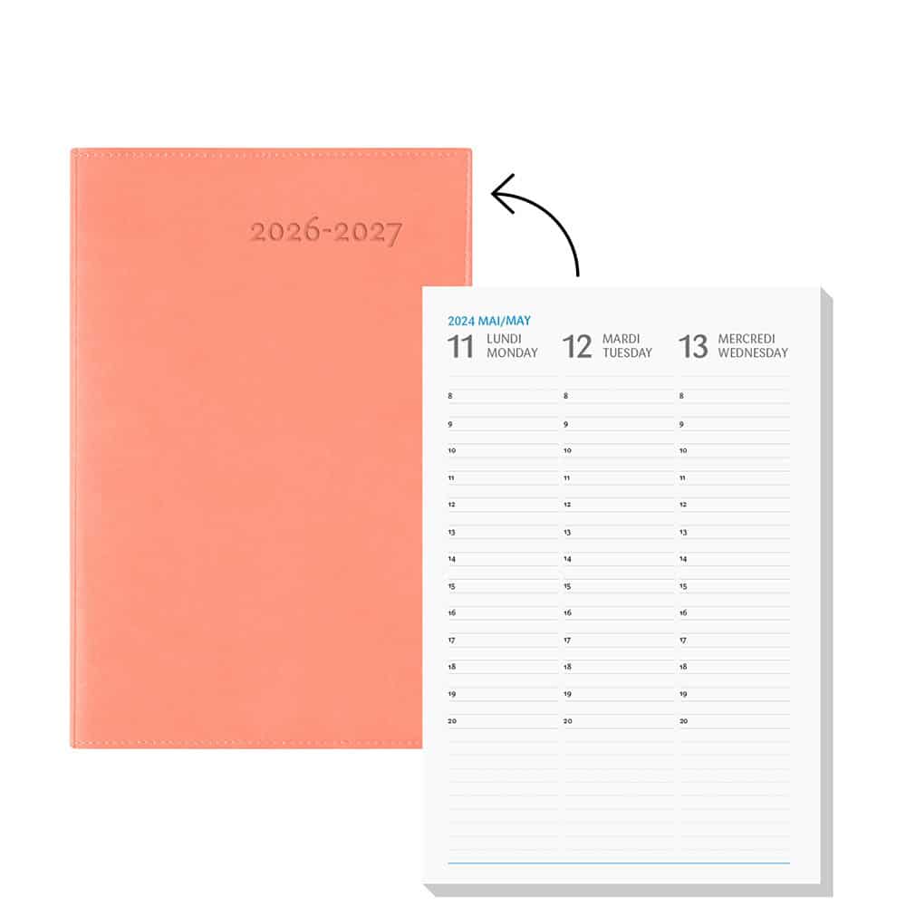Le Gama est parmi nos agendas les plus populaires. Avec sa couverture souple et flexible, il est disponible en 6 couleurs. Idéal pour celles et ceux qui aiment avoir de l’espace pour personnaliser leur agenda : une généreuse section de notes est présente sur chaque page. La grille de 1 semaine sur 2 pages permet d’avoir un coup d’œil immédiat sur la semaine en cours. Il inclut aussi une section de planification mensuelle de 12 pages (1 mois par page) et 18 pages de notes lignées. L’agenda s’ouvre à plat et toujours à la bonne page, grâce à ses coins détachables.