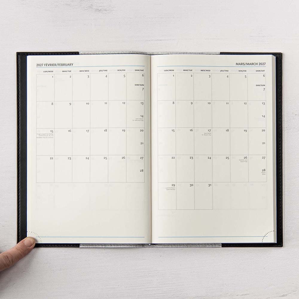 Le Gama est parmi nos agendas les plus populaires. Avec sa couverture souple et flexible, il est disponible en 6 couleurs. Idéal pour celles et ceux qui aiment avoir de l’espace pour personnaliser leur agenda : une généreuse section de notes est présente sur chaque page. La grille de 1 semaine sur 2 pages permet d’avoir un coup d’œil immédiat sur la semaine en cours. Il inclut aussi une section de planification mensuelle de 12 pages (1 mois par page) et 18 pages de notes lignées. L’agenda s’ouvre à plat et toujours à la bonne page, grâce à ses coins détachables.