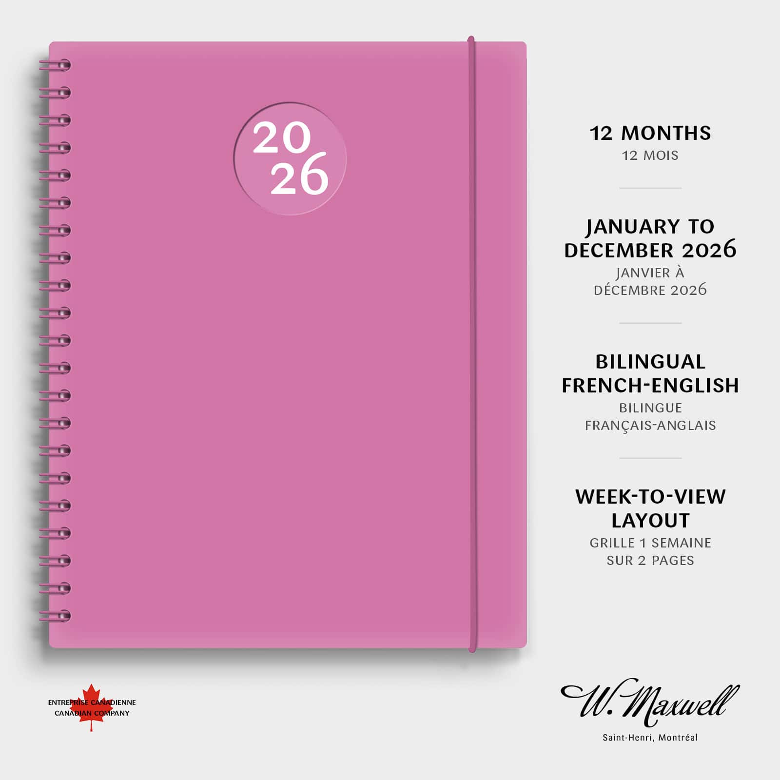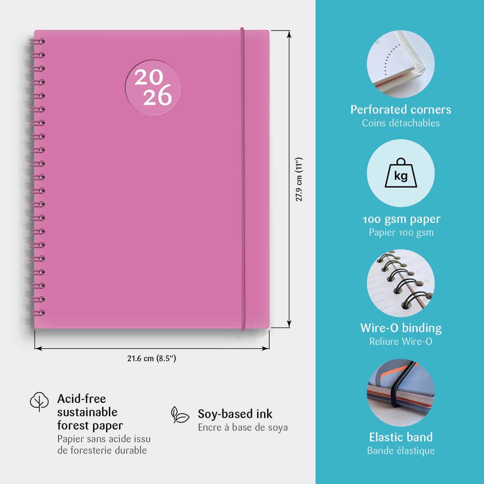 Le Kibo est très populaire parmi la population étudiante. Sa fonctionnalité a fait ses preuves. De grandes pages format lettre, la semaine bien en vue avec sa grille de 1 semaine sur 2 pages et un encadré spacieux sur chaque page pour noter tout ce qui vous passe par la tête. Il inclut aussi 14 pages de notes. La reliure spirale permet de l’ouvrir à 360 degrés et d’écrire partout où vous vous trouvez. Il est facile d’être toujours à la bonne page grâce à ses coins détachables.