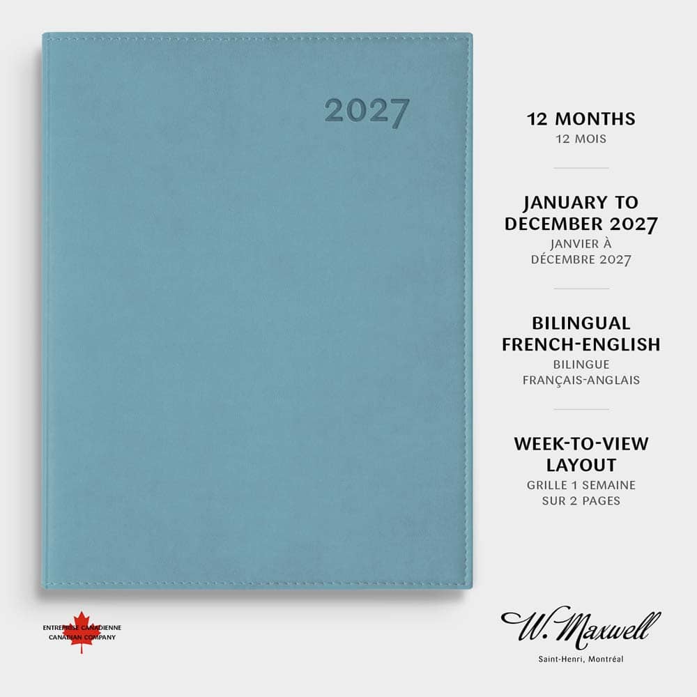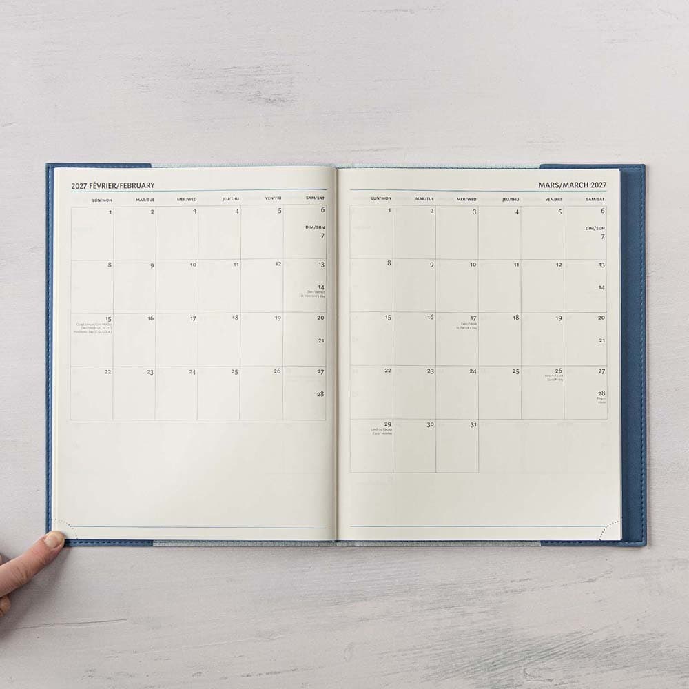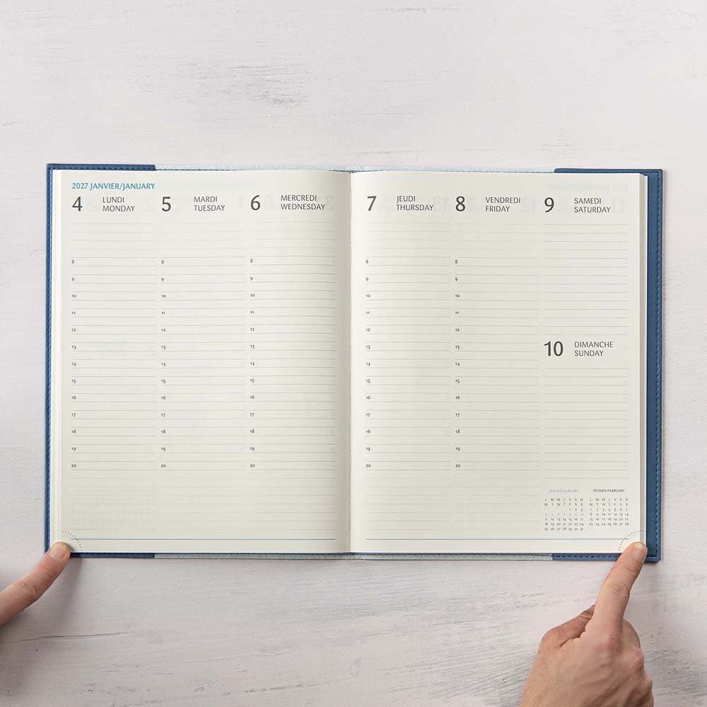 Le grand format du Ulys est idéal pour ceux et celles qui veulent tout, tout noter. Ses pages sont de format lettre : ajouter des feuilles n’aura jamais été aussi facile. Le déroulement de la semaine est toujours sous les yeux avec la grille de 1 semaine sur 2 pages, tandis que l’espace en haut et en bas de chaque jour permet de noter toute information complémentaire. Le Ulys a une couverture souple effet suède disponible en 6 couleurs et inclut une section de planification mensuelle (1 mois par page) et 18 pages de notes lignées.