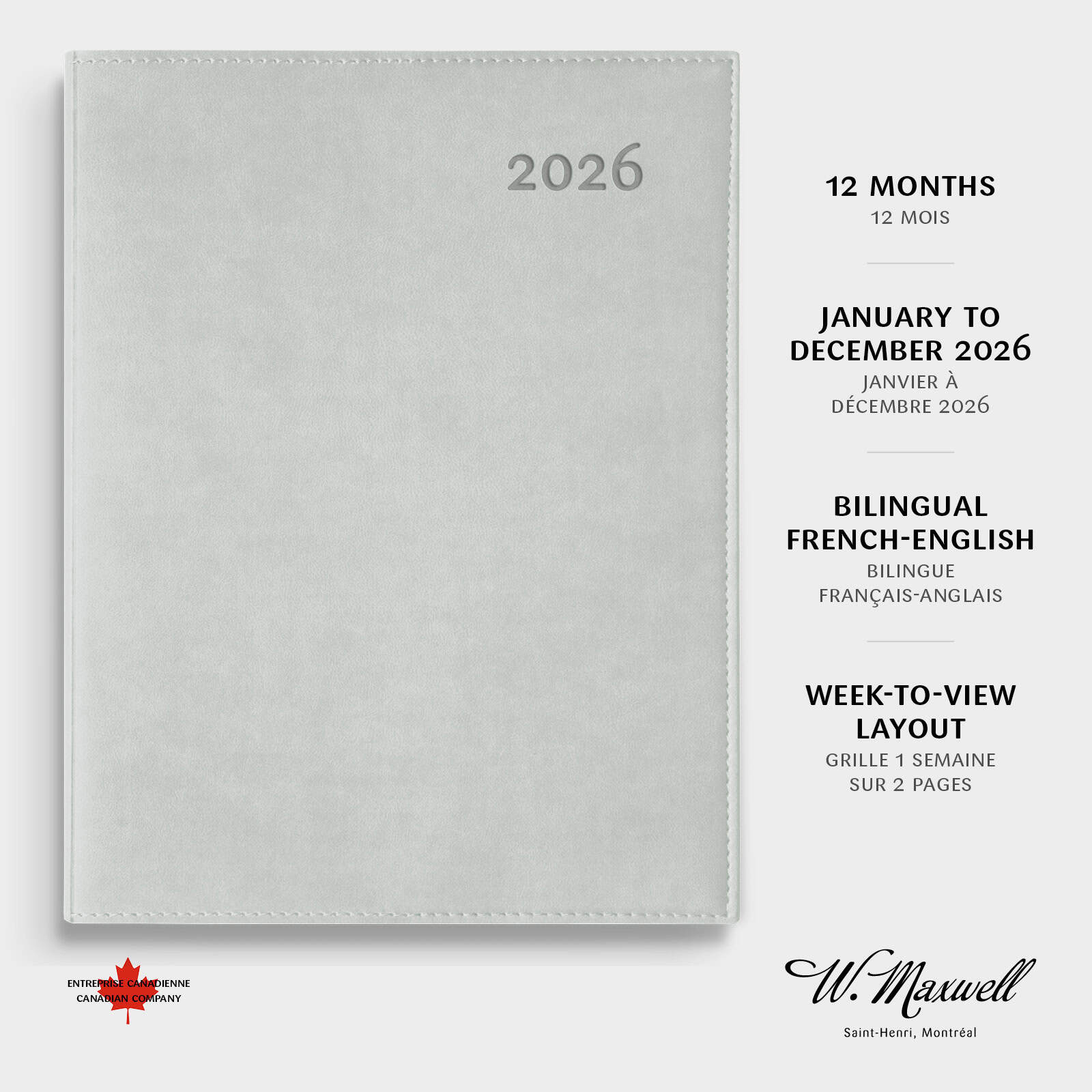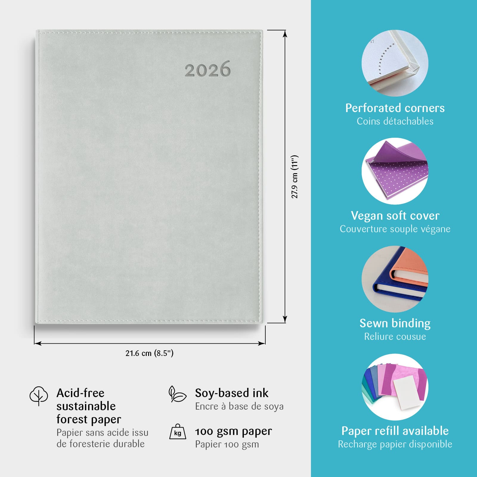 Le grand format du Ulys est idéal pour ceux et celles qui veulent tout, tout noter. Ses pages sont de format lettre : ajouter des feuilles n’aura jamais été aussi facile. Le déroulement de la semaine est toujours sous les yeux avec la grille de 1 semaine sur 2 pages, tandis que l’espace en haut et en bas de chaque jour permet de noter toute information complémentaire. Le Ulys a une couverture souple effet suède disponible en 6 couleurs et inclut une section de planification mensuelle (1 mois par page) et 18 pages de notes lignées.